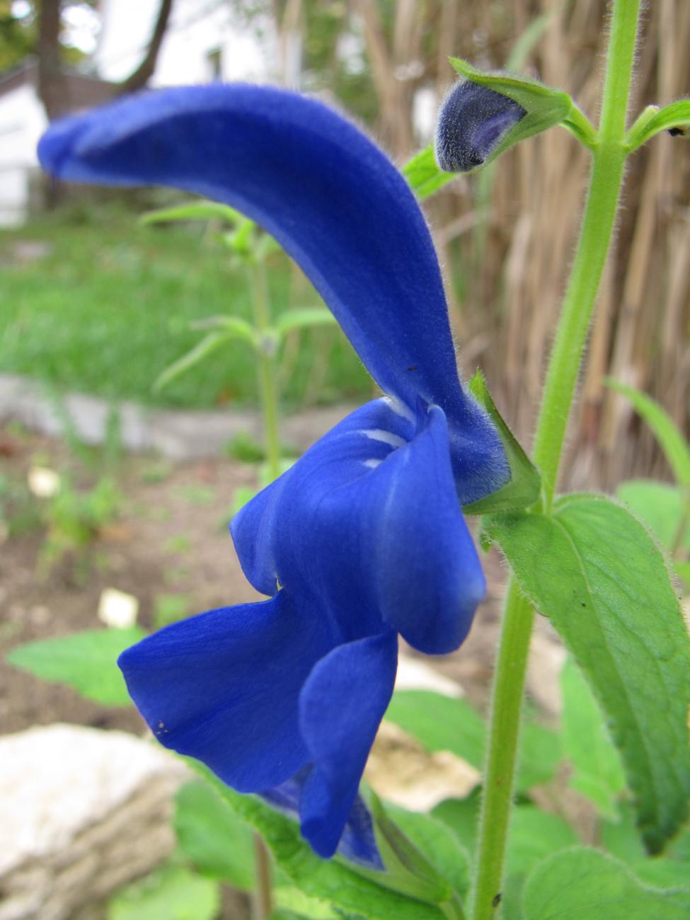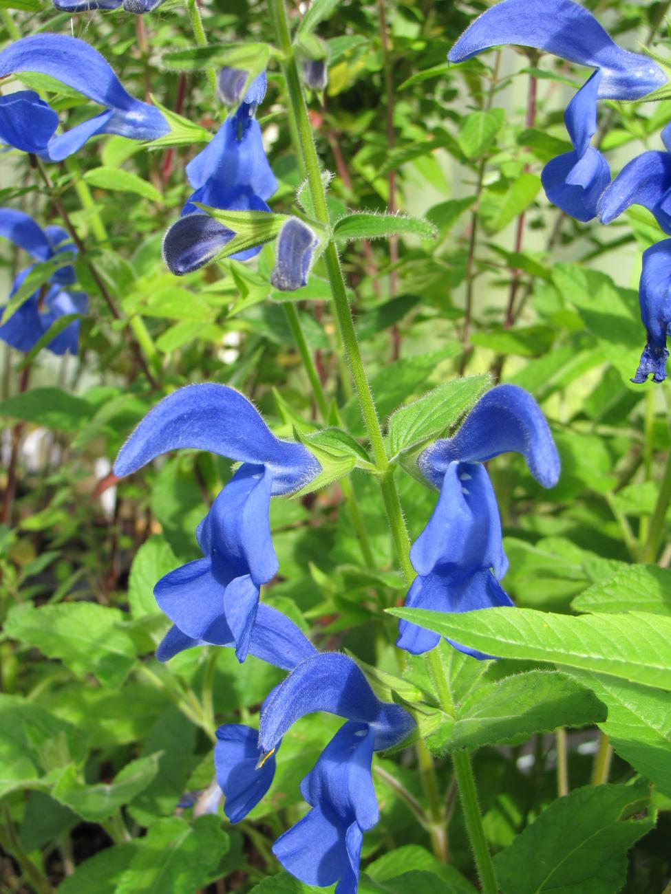 Großblütige Enziansalbei; besonders groß- und reichblütige Auslese. Sehr schöne, verzweigt wachsende Kübelpflanze. Duftende Blätter und wunderschöne himmelblaue Blütenvon beeindruckender Größe (4,5 cm). Sonniger Standort; regelmäßig gießen und düngen. Die Enziansalbei ist die einzige Salbeiart, die zur Überwinterung Knollen ausbildet. Kältetoleranz bis -5°C; daher frostfrei überwintern.